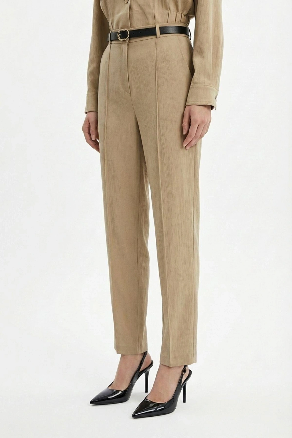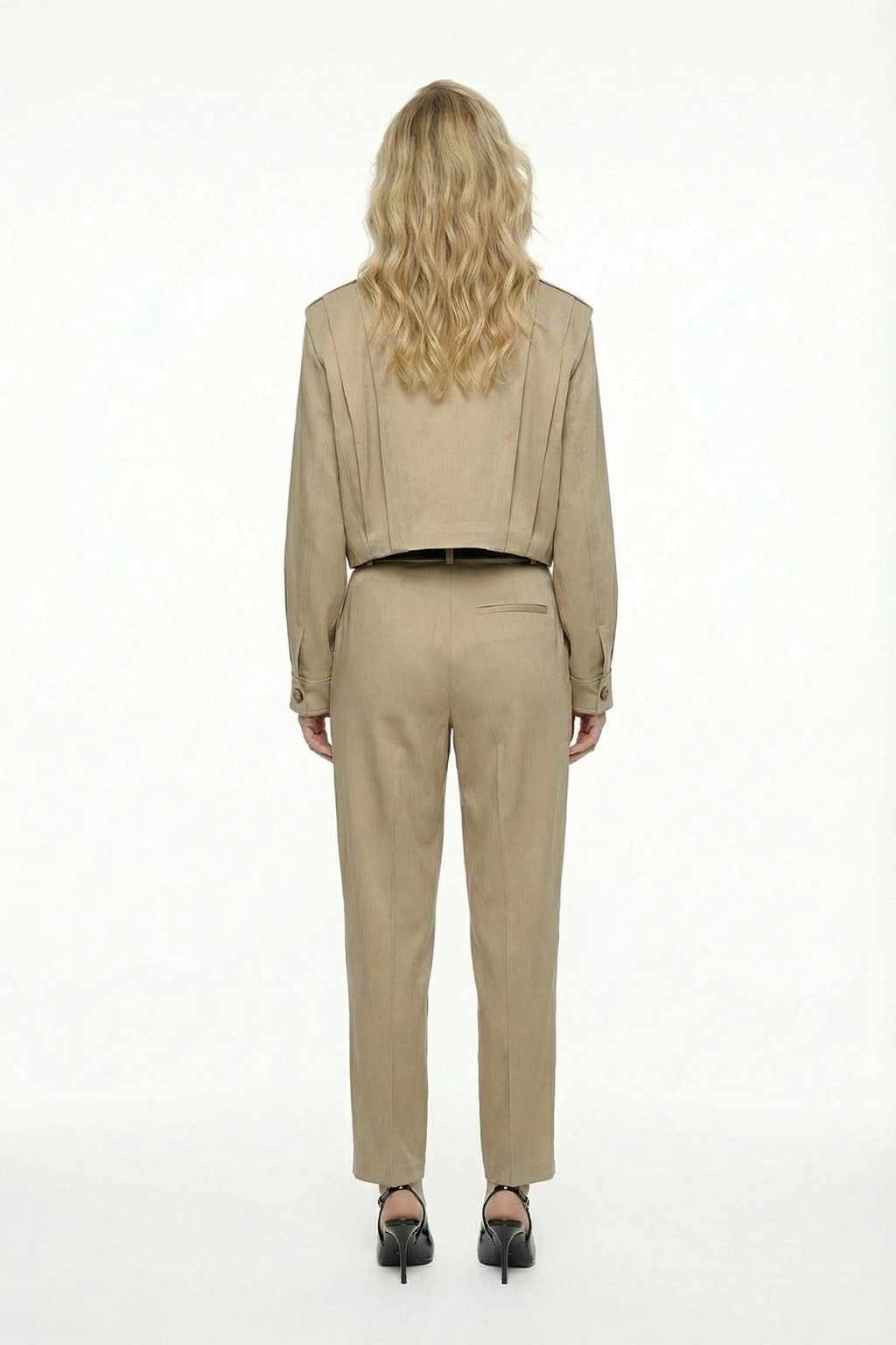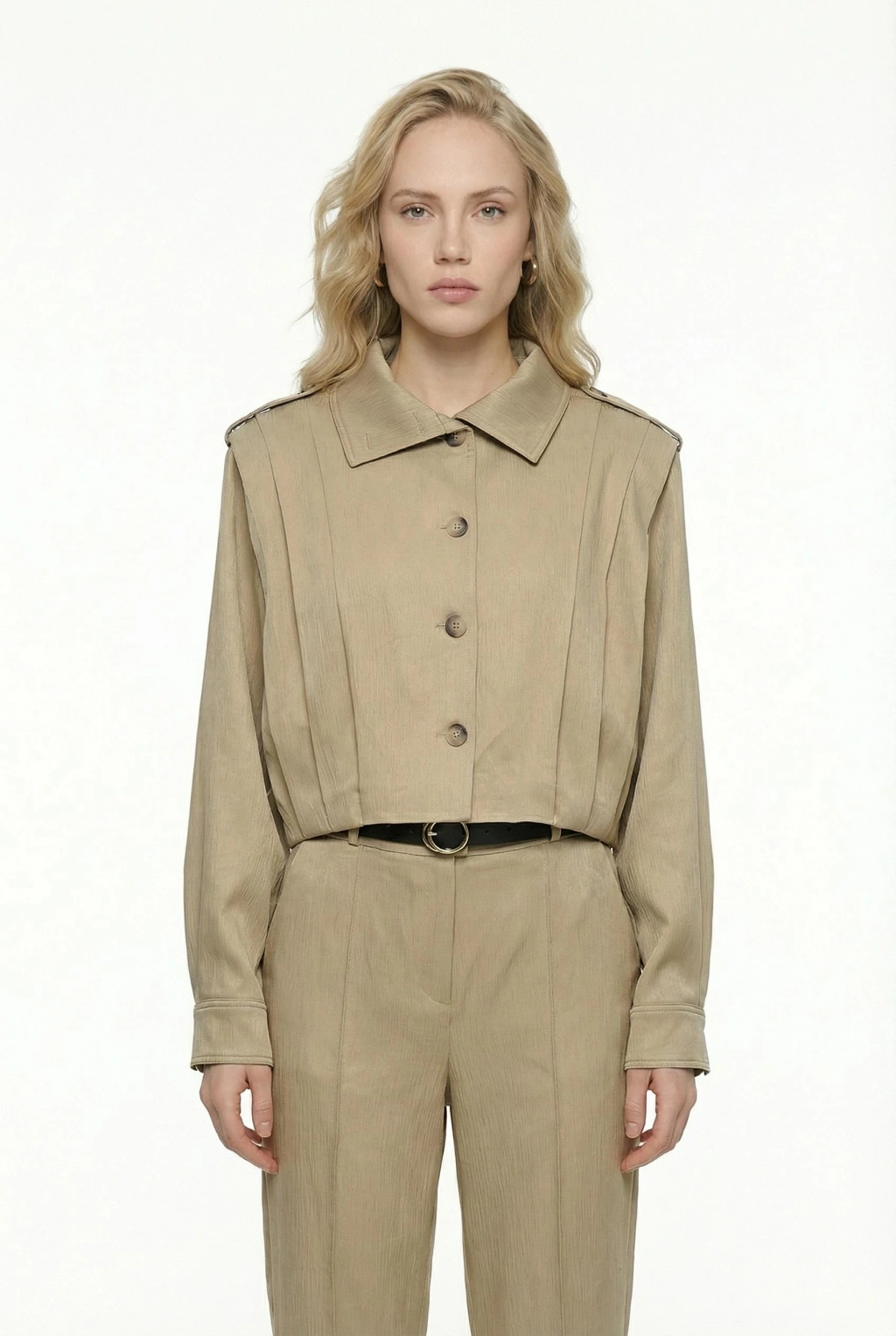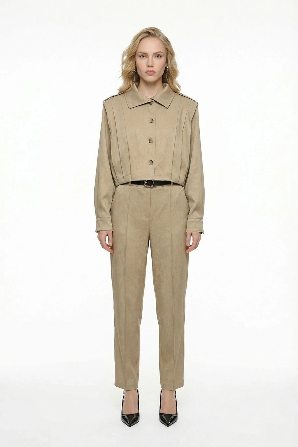 Dik Yaka Bomber Ceketli Biye Kemer Detaylı Bej Takım