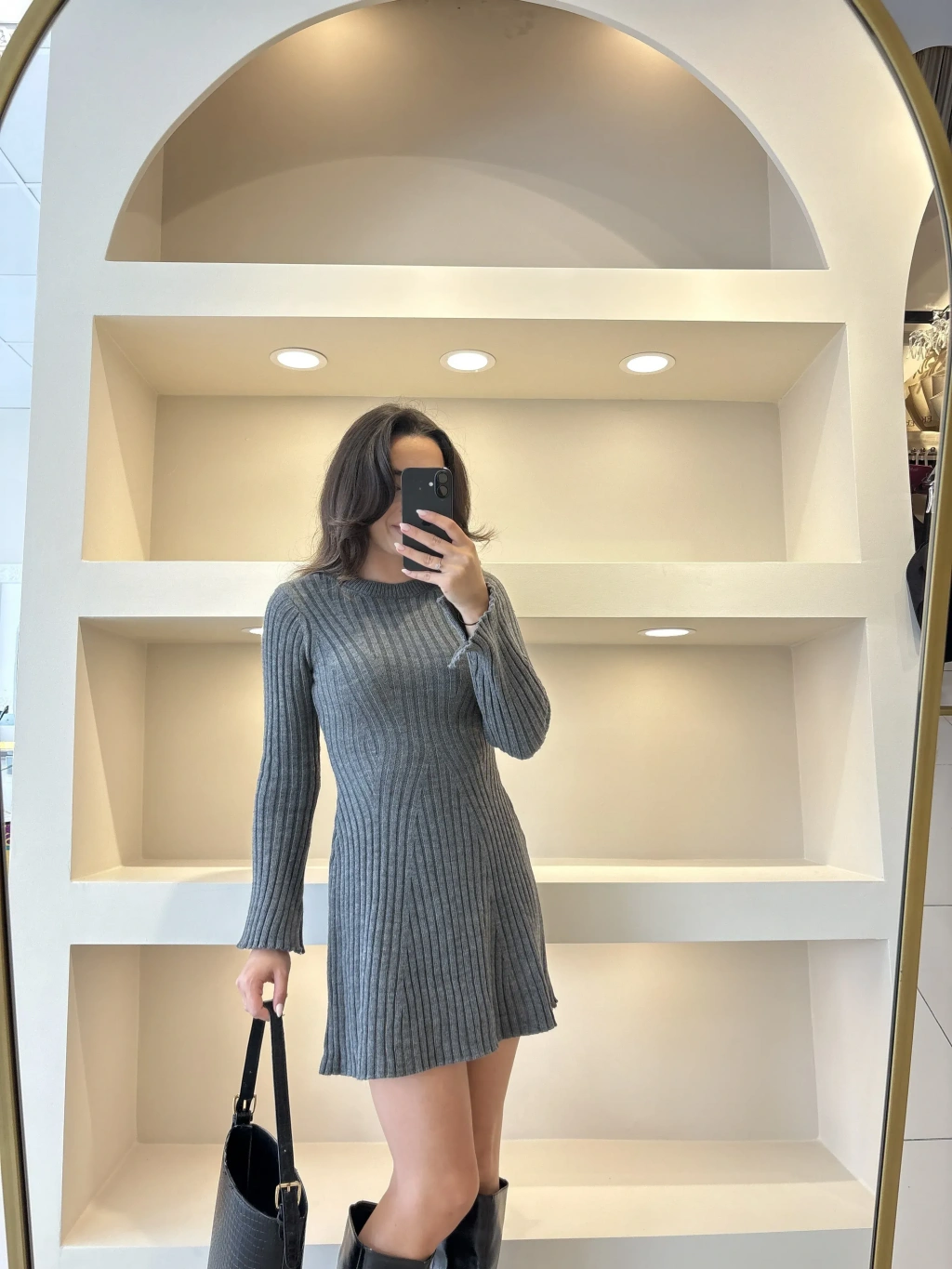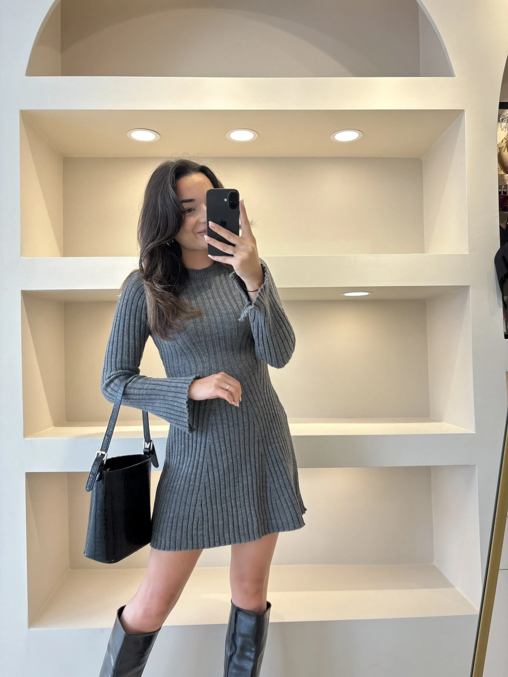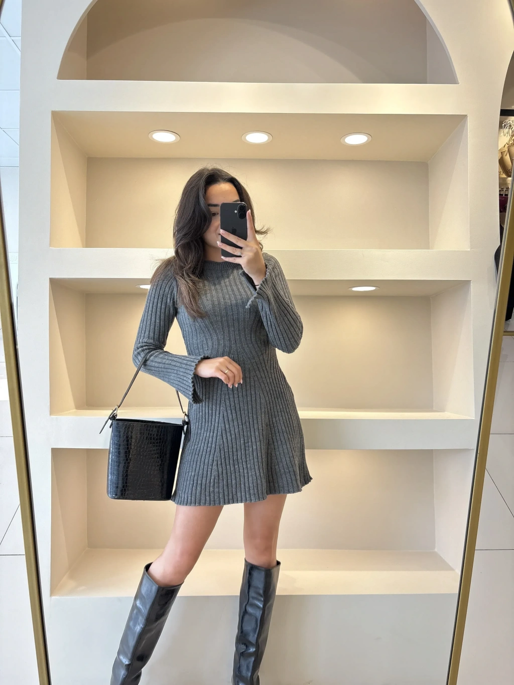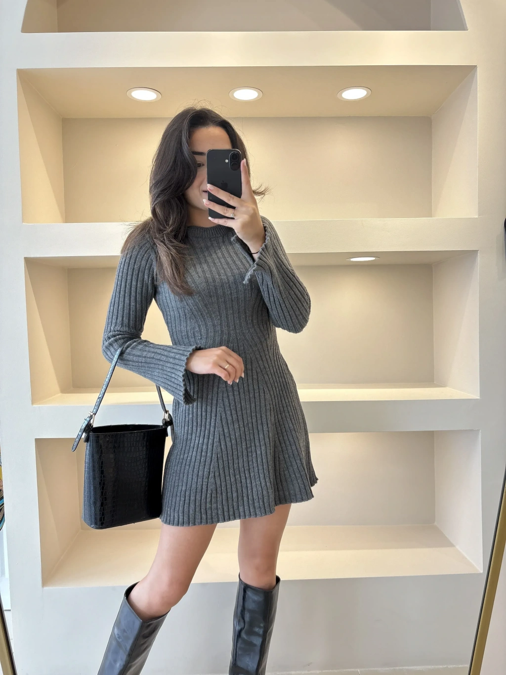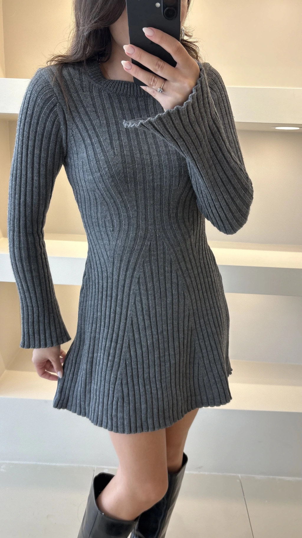 Triko Gri Kol Yırtmaç Detaylı Elbise